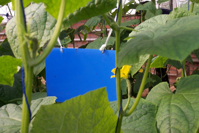 3、在植物上使用懸掛高度建議高度植物頂端15-30cm左右,蔓生或高桿作物生長點(diǎn)接近棚頂時,可將色板懸掛于植株高度的中上部。